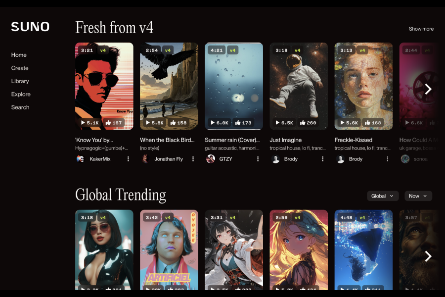 Suno는 텍스트만으로 음악을 만들어내는 서비스예요. 사용자가 “집중할 때 듣기 좋은 잔잔한 로파이 음악”이라고 입력하면, AI가 이에 맞는 음악을 생성하죠. K-POP, 힙합, 재즈, 클래식 등 다양한 장르를 지원하며, 한국어 프롬프트도 가능해요.