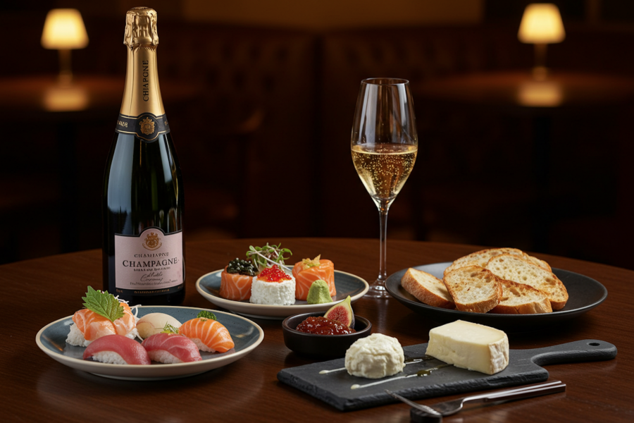 스시는 엑스트라 브뤼 등 매우 낮은 당도의 샴페인과 잘 어울리는데, 이는 딤섬과의 궁합도 좋다.