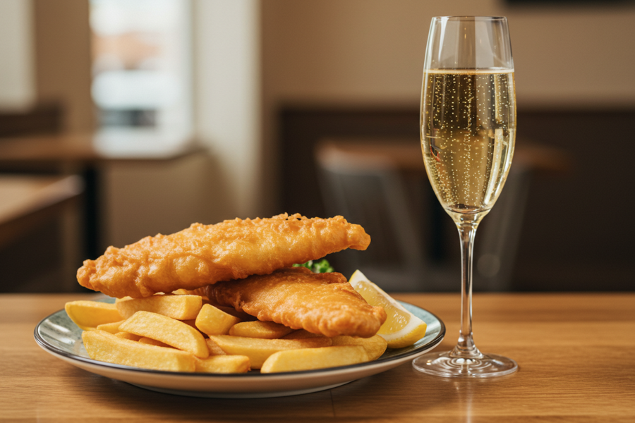 음식과 샴페인을 페어링할 때 샴페인에 대해 말할 수 있는 분명한 것은 식감, 즉 기포의 자극적인 감각으로 미각이 상쾌해지고, 다음 한입을 준비한다는 것이다. 따라서 샴페인은 기본적으로 피시 앤 칩스, 슈니첼, 아란치니 같은 튀긴 음식과 잘 어울리고, 크리미한 소스의 느끼함을 잡아주는 역할을 한다.