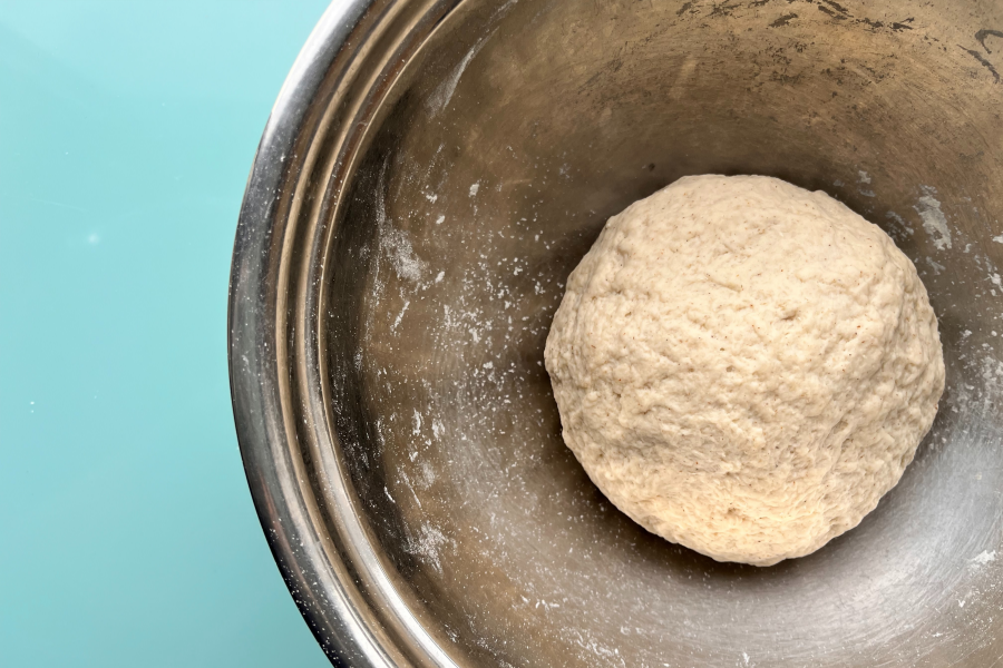 대충 한 덩어리가 된 반죽을, 강력분을 흩뿌린 도마나 작업대 위에 올린 후, 반죽 표면이 웬만큼 매끈해질 때까지 약 5분간 개어 줘요.(한 손으로는 반죽을 잡고서, 다른 손으로는 반죽을 늘려주고, 늘린 반죽을 접어 방향을 바꾼 다음, 다시 동일한 동작을 반복합니다. 도중에 반죽이 질다 싶으면, 그때마다 주저 말고 작업대 바닥에 강력분 흩뿌려주기를 반복해요.) / 반죽 표면이 어느 정도 균일하게 매끈해지면 3~4등분 하여 각기 둥글게 모양을 잡아 준 후, 각각 밀폐용기에 담아 뚜껑 닫고 상온에서 최소 2시간 발효시켜요.(용기 바닥에 올리브오일을 발라 준 뒤 반죽을 담아야, 발효 후 스르르 떼어져요.)
