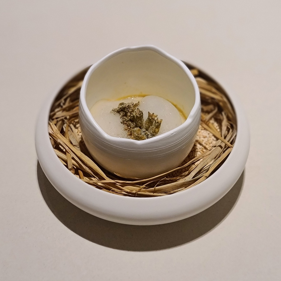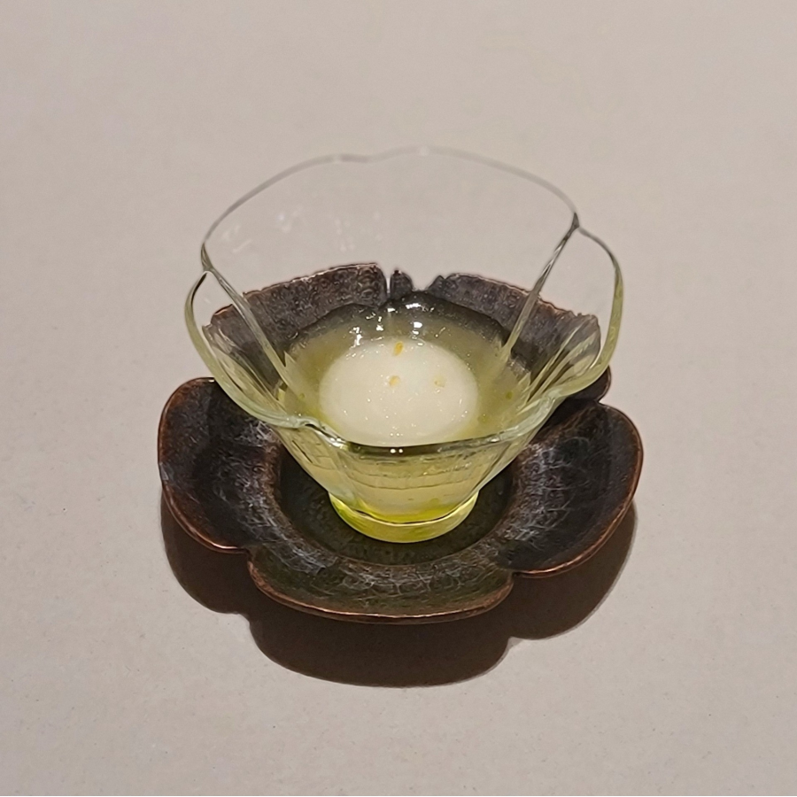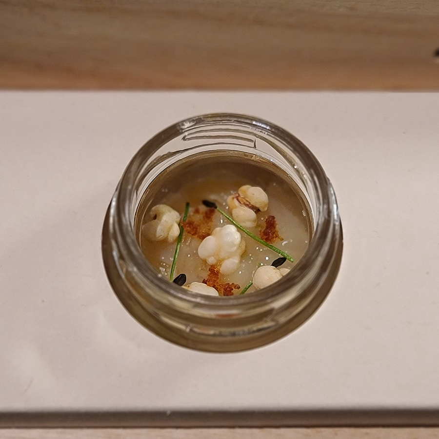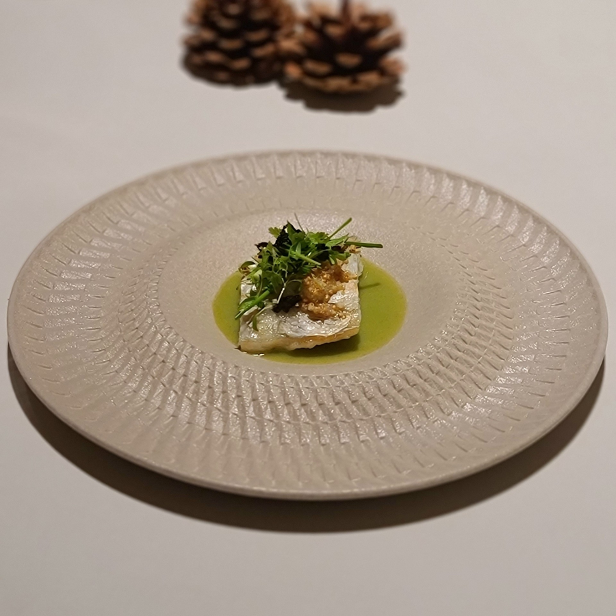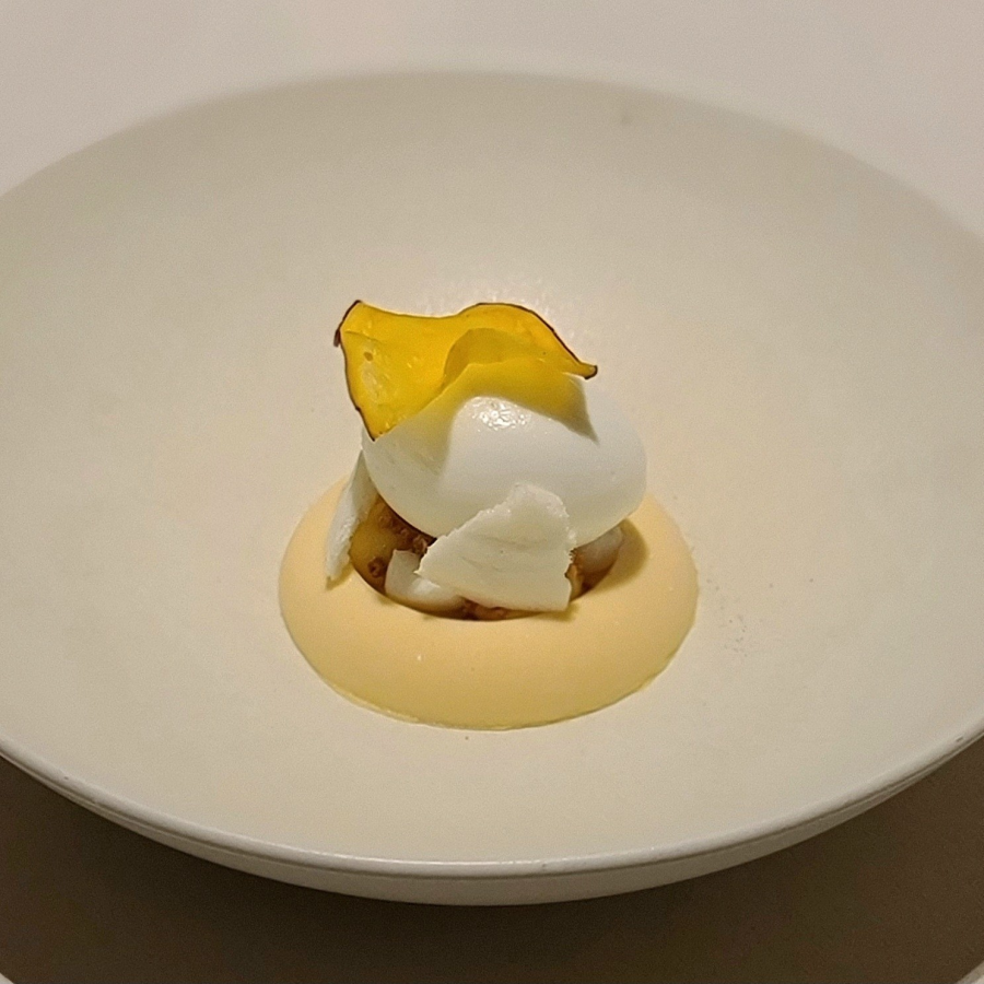 메인 다이닝 홀에서의 첫 디쉬. 대게 살과 내장을 넣은 달걀찜에 컬리플라워 퓨레와 랠리쉬, 고소한 들기름, 진한 풍미의 비스크 폼, 바삭한 깨보숭이를 더했다. 부드럽고 은은하면서도 단조롭지 않고, 식감과 풍미의 레이어가 다채롭다.