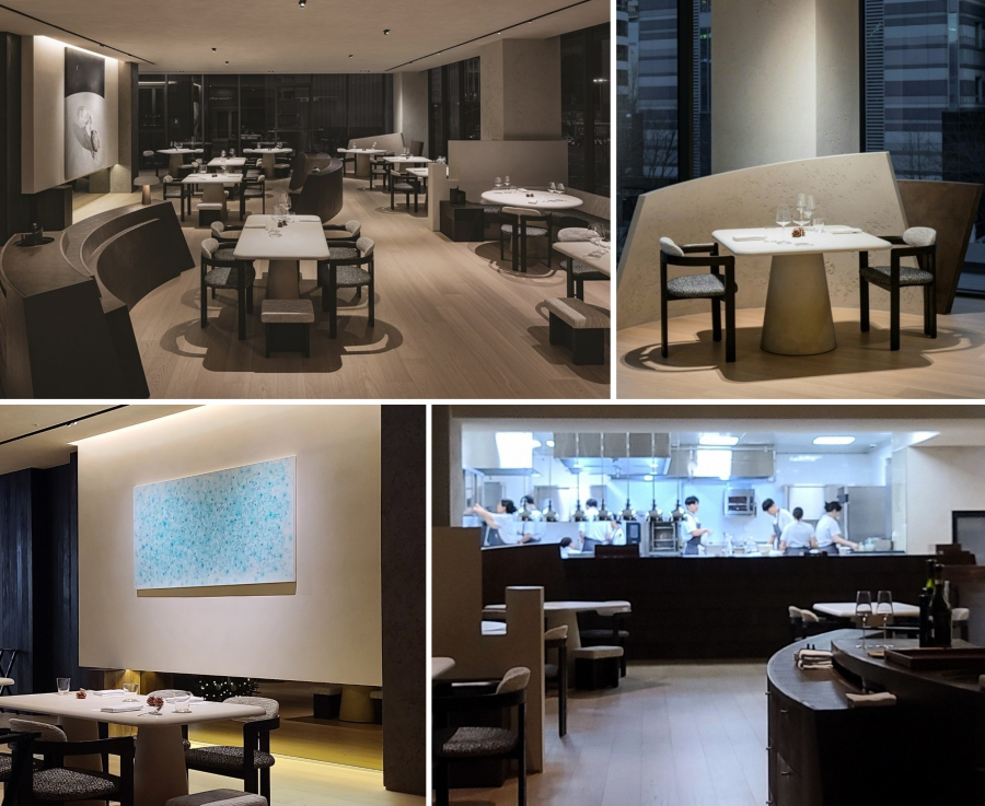 이어지는 본격적인 디너 코스를 즐길 메인 다이닝 홀은 프라이빗함과 개방감을 동시에 가진 식사 공간, 역동적인 에너지를 가진 오픈 키친, 와인룸 구성으로, 예술적인 감성이 가득하다. 공간의 전반적인 조도를 낮추고 화이트 테이블 위에 핀 조명을 맞춰 요리들이 마치 미술관의 작품처럼 보이도록 연출했으며, 서울 소재 갤러리들과 협업해 한국 예술가들의 작품을 전시하고 있다.