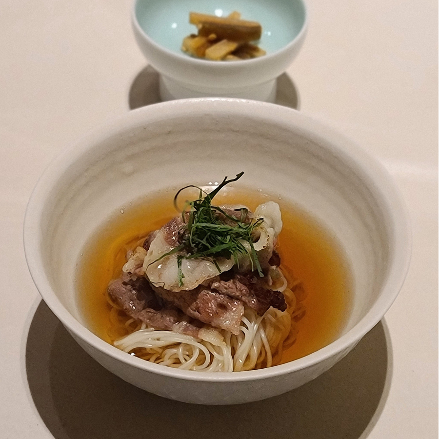 메뉴판에는 나와 있지 않은 솔밤의 우엉 국수. 참나무숯 향을 입힌 차돌박이, 담백하고 깊은 우엉 육수. 식사의 마무리로 따뜻한 국수를 먹는 한국 식문화의 전통을 담았다고.
