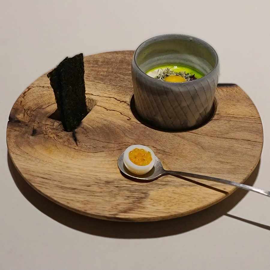 막걸리 식초에 살짝 절인 후 훈연한 겨울 고등어와 묵은지, 크림치즈 소스, 피클링한 메추리알 노른자, 적시소, 차조기 오일. 그리고 스푼 위에는 메추리알 흰자와 송어알.
