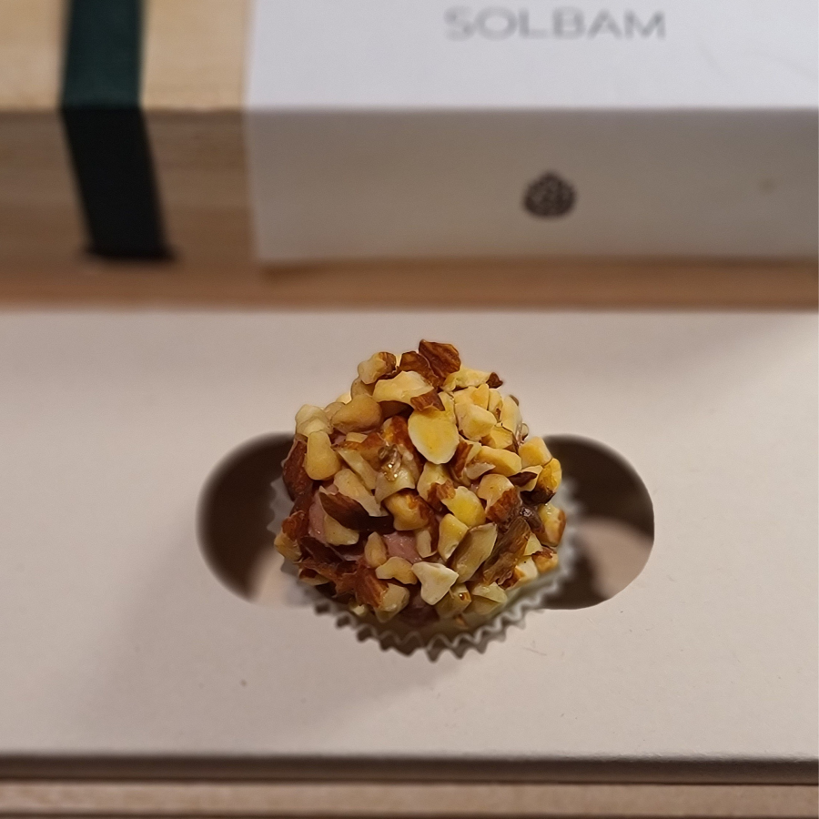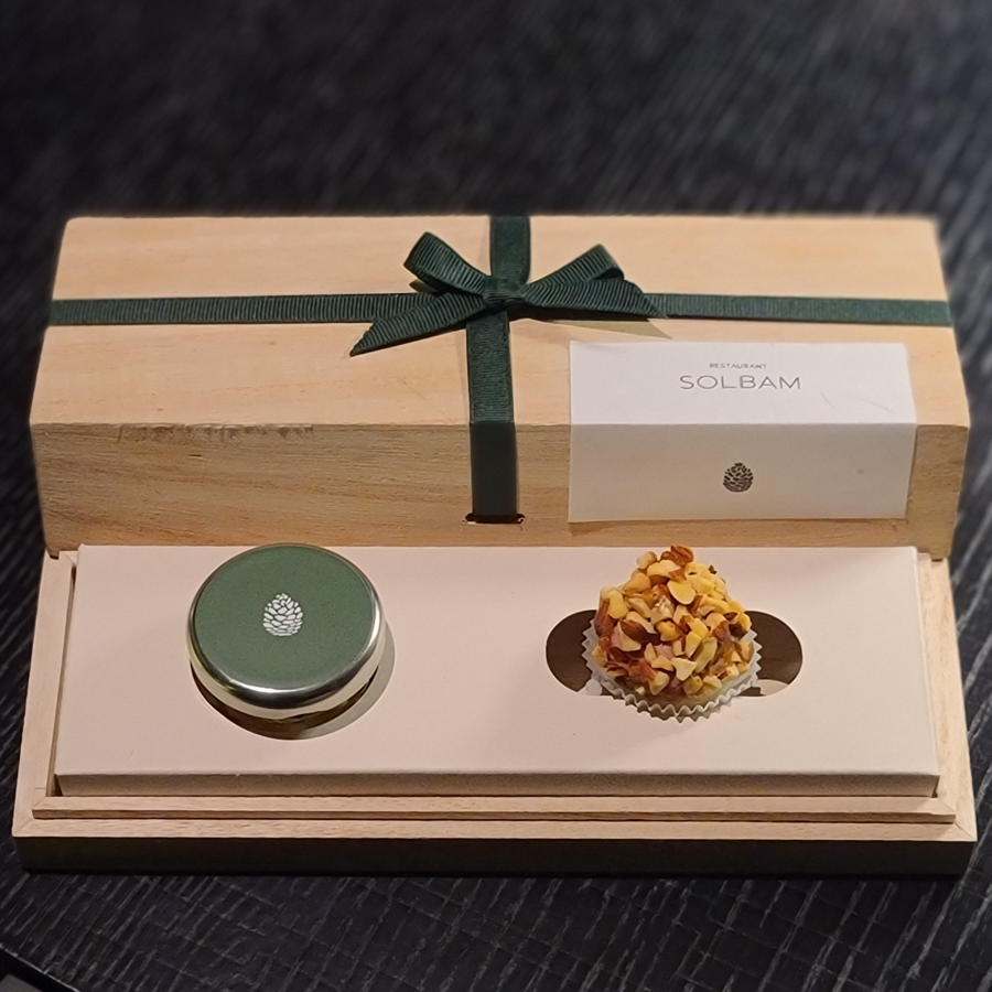 솔밤의 시그니처 컬러인 Pine green color 리본으로 장식한 나무 상자 안에, 작고 귀여운 두 가지 종류의 한 입 거리가 들어있다.