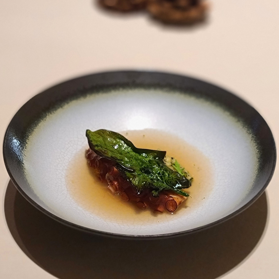 저온에서 부드럽게 익힌 후 숯불에 한 번 더 구운 문어, 숯불로 향을 입힌 쑥갓, 겨울 섬초와 톡톡 터지는 식감의 찰보리, 무와 대파와 다시마로 맑게 우려낸 육수, 레몬즙, 향긋한 쑥갓 오일.