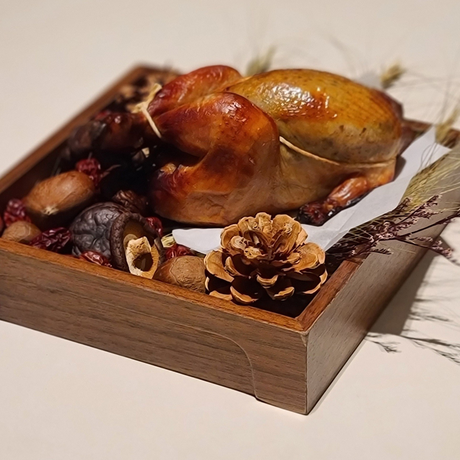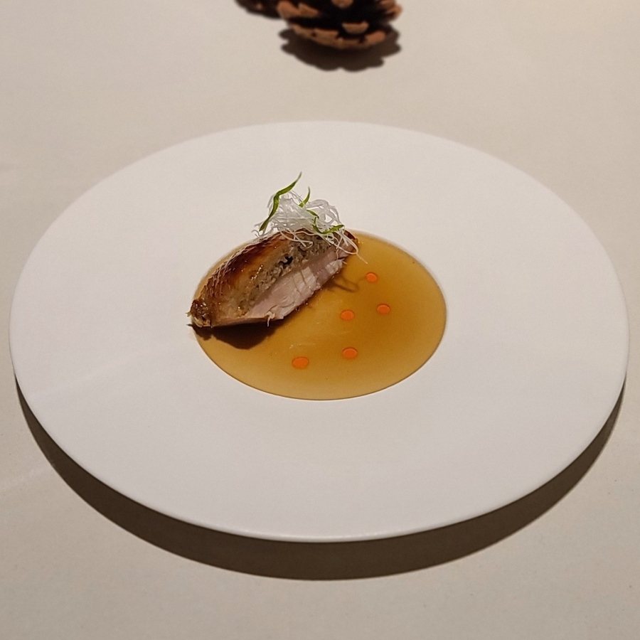 솔밤의 안동찜닭. 엄태준 셰프의 고향이기도 한 안동의 안동찜닭을 통구이 방식으로 재해석한 요리다. 어린 닭을 간장 베이스의 양념에 재워 맛을 입힌 뒤, 껍질과 살 사이에 통통한 알밤과 양송이, 목이버섯으로 만든 뒥셀을 채워 숯불에 구워냈다.