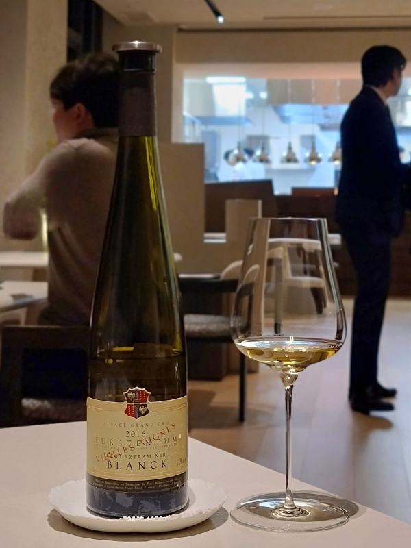 디너 12와 페어링한 ‘도멘 폴 블랑크 게뷔르츠트라미너 그랑크뤼 프루스텐툼 2016’. 알자스 지역의 풀바디 게뷔르츠트라미너 와인이다. 산도가 높지 않고 과실향이 풍부하며 아로마틱하고 은은한 잔당감이 있어, 온도를 약간 높이면 은은하고 부드러운 디저트와 페어링하기에 좋다.