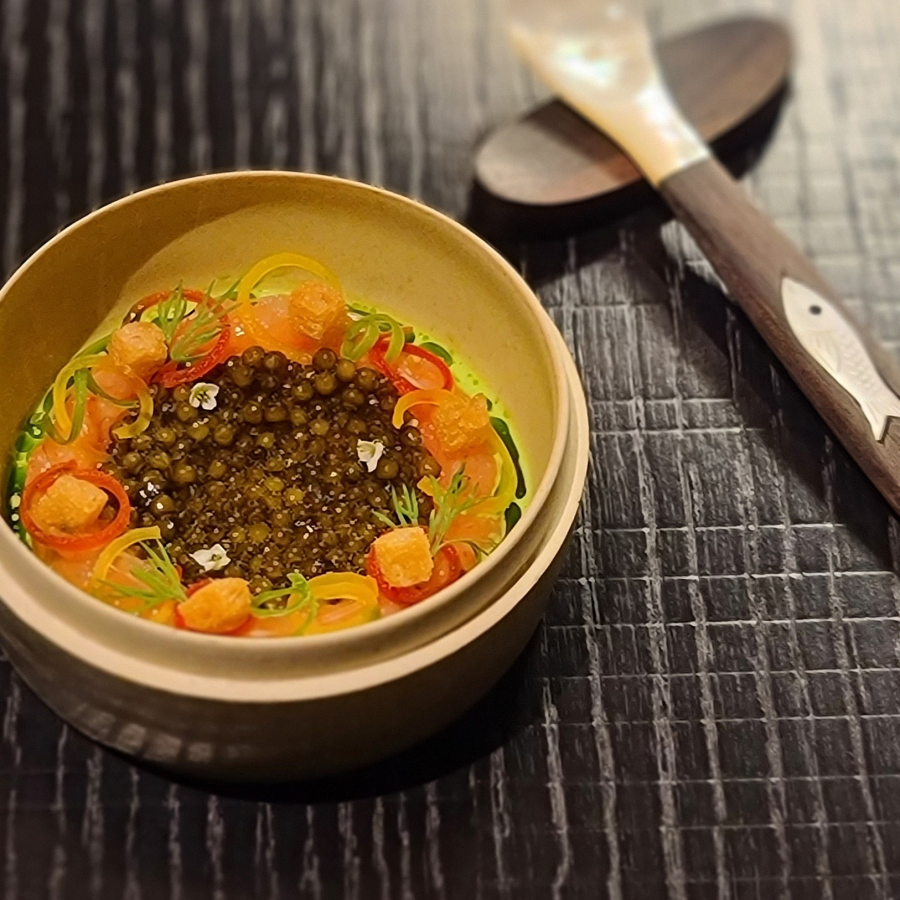 카비아리 브랜드의 다우리쿠스 캐비어, 레몬 제스트를 더한 단새우, 간장 크림치즈 뵈브아(bavarois), 알싸한 대파와 아삭하고 싱그러운 파프리카, 은은한 단맛을 을 가진 부드러운 딜 소스와 향긋한 딜 오일, 바삭한 크루통.