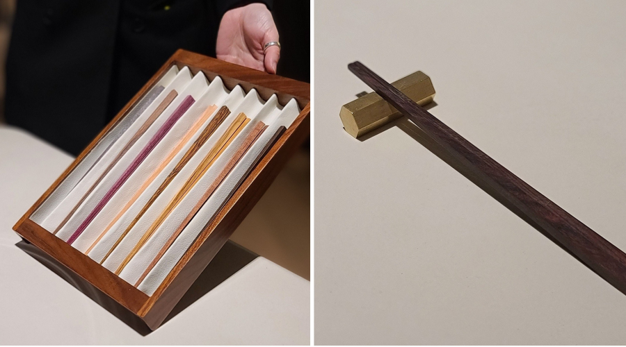 드디어 솔밤의 시그니처인 젓가락 고르기 타임! 손님이 이 중에서 취향에 맞는 젓가락을 골라 사용하고 나면, 가볍게 세척한 후 봉투에 담아 선물한다. 감동 포인트는, 솔밤 팀원들이 나무를 갈고 기름을 먹여가며 손수 만든 젓가락이라는 것.