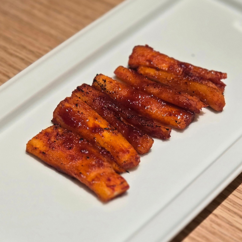 직접 담근 고추장으로 양념해 직화로 구운 더덕구이. 색감은 강렬하지만 맵지 않고, 단맛이 살아 있다.
