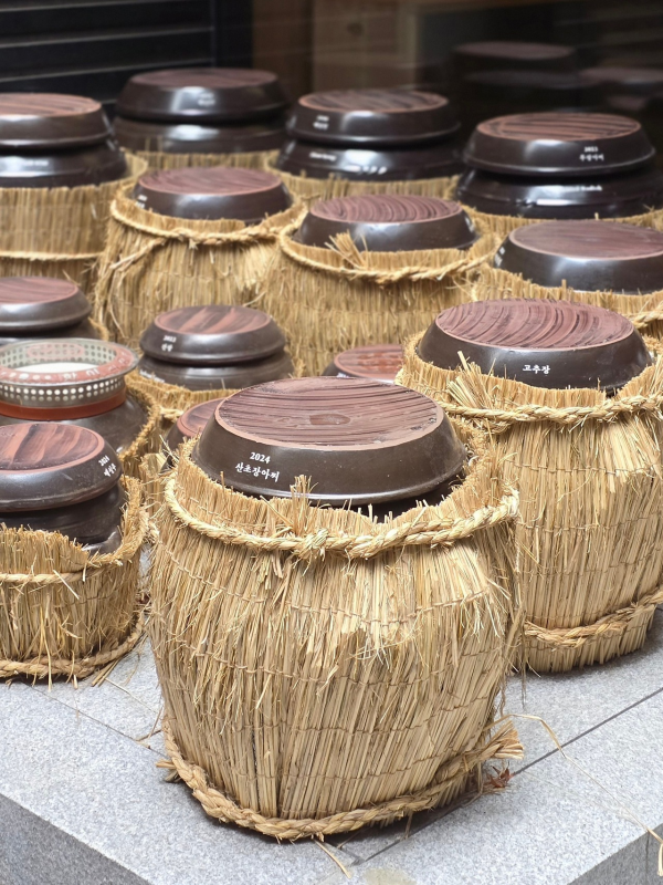 <비움>에 들어서기 전, 가장 먼저 만나는 장독대. 직접 담근 장류, 장아찌, 전통주 등이 담겨 있다.