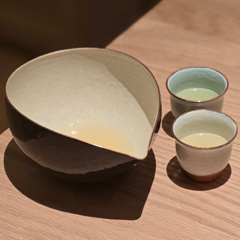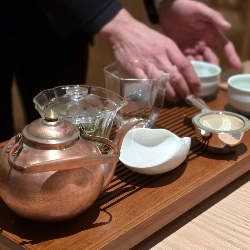 차 / 제주 유기농 우전차. 곡우(穀雨) 이전의 어린 첫 잎을 따서 가공한 차를 우전(雨前)차라 하며, 이는 최상급 차에 속한다. 고대현 지배인이 테이블 앞에 서서 다기들을 데우고, 세차를 하고, 개완에서 우리고, 숙우에서 온도를 맞춘 후 정성스레 잔에 따르는 일련의 모습 속에 전통 다도 예법의 품격이 담겨있다. 첫 번째 잔은 향과 색을 온전히 즐기기 좋도록 은은하게, 두 번째 잔은 다과와 함께 즐기기 좋도록 진하게.